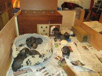 Jetzt haben wir alle zusammen die 5. Woche geschafft. Die Welpen haben sich wacker geschlagen und wir auch! Der Tagesablauf besteht nicht nur aus Fressen, Schlafen und Verdauen, sondern man kann jetzt herrlich miteinander spielen bzw. raufen. Eine der Hündinnen hat es einem Rüden nachgemacht und hat mehrfach mit einem beherzten Sprung das zugedachte Areal verlassen. So wurden wir im Flur von ihr empfangen und heute saß sie auf einmal in der Küche und jammerte vor sich hin. Wahrscheinlich war sie über ihren Mut selbst erschrocken. Nun mussten wir eine weitere Erhöhung anbringen, um uns zu schützen! Leider hat das nasskalte Wetter einen Ausflug in die Natur mit der gesamten Brut verhindert. Aber aufgeschoben ist nicht aufgehoben. Wir bleiben am Ball.